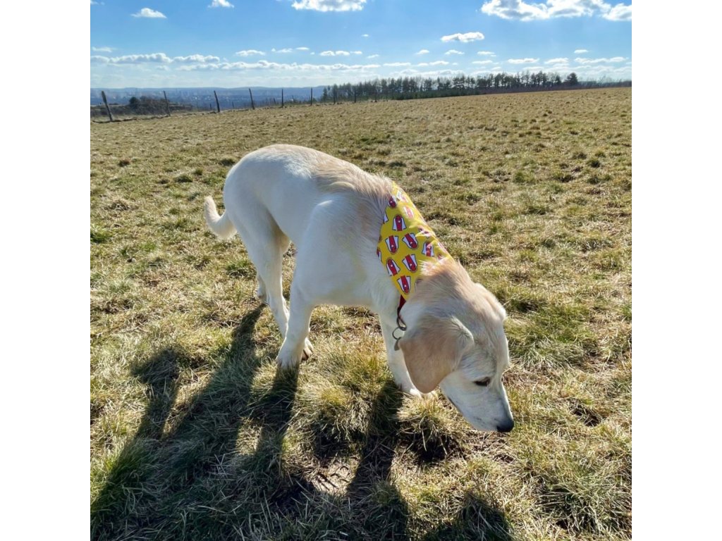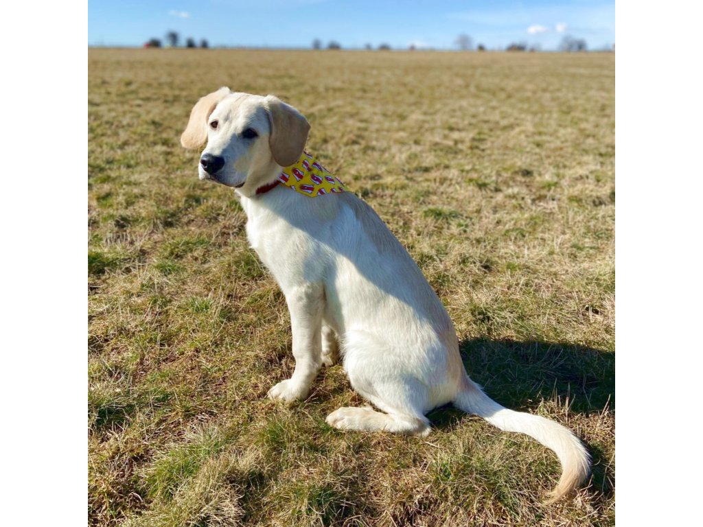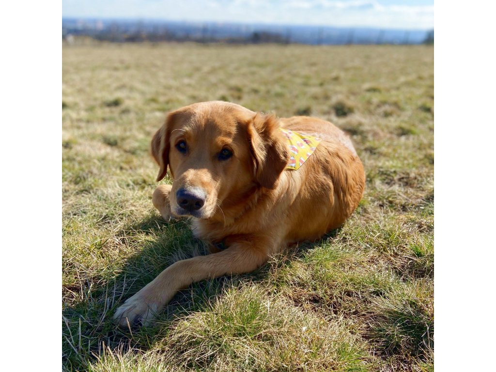 Modelka Bella (kříženec labradorského a zlatého retrívra) oblékla šátek velikosti L.