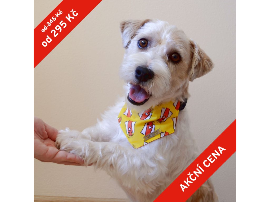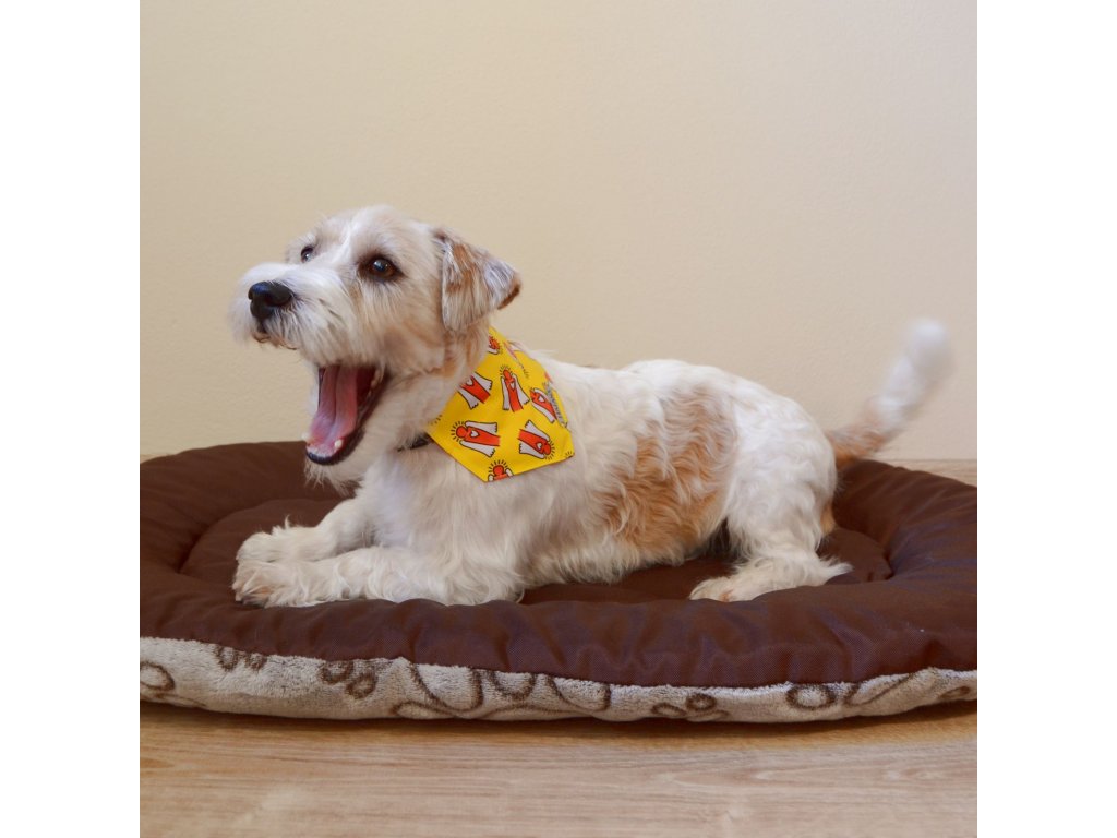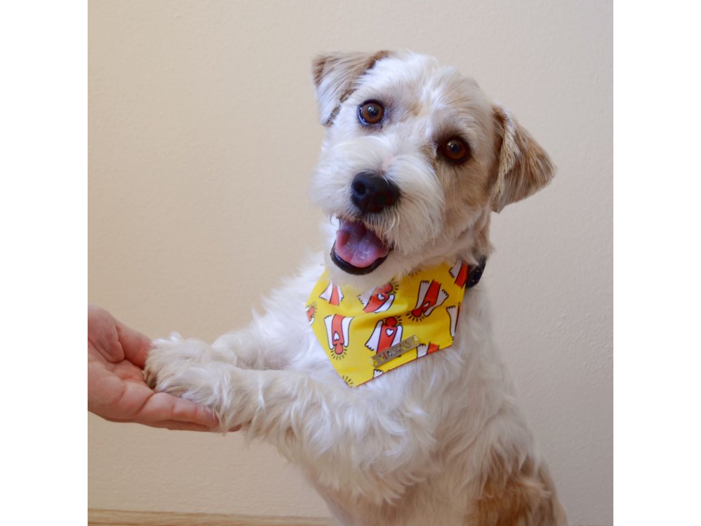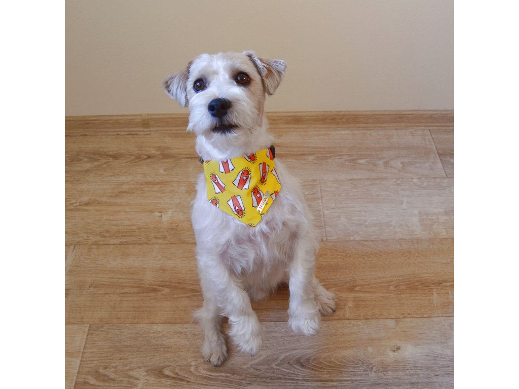 Model Duncan (hrubosrstý Jack Russell teriér) má na sobě šátek velikosti S.