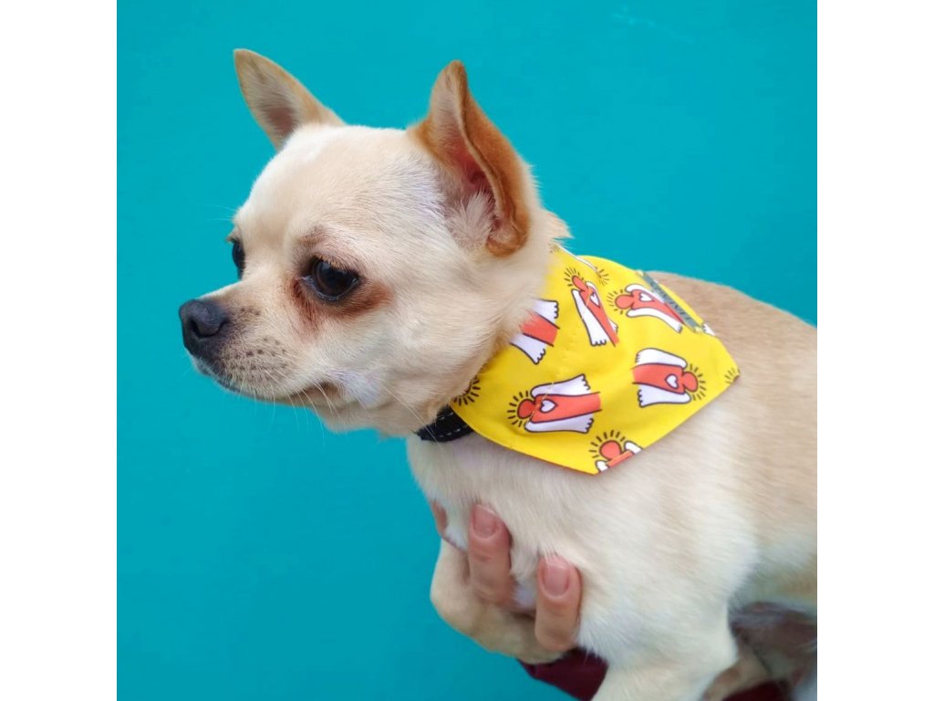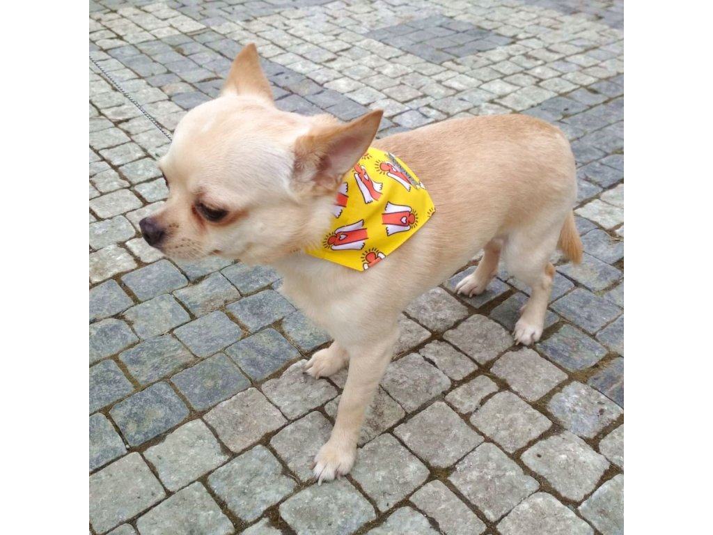 Model Sam (čivava) má na sobě šátek velikosti S.